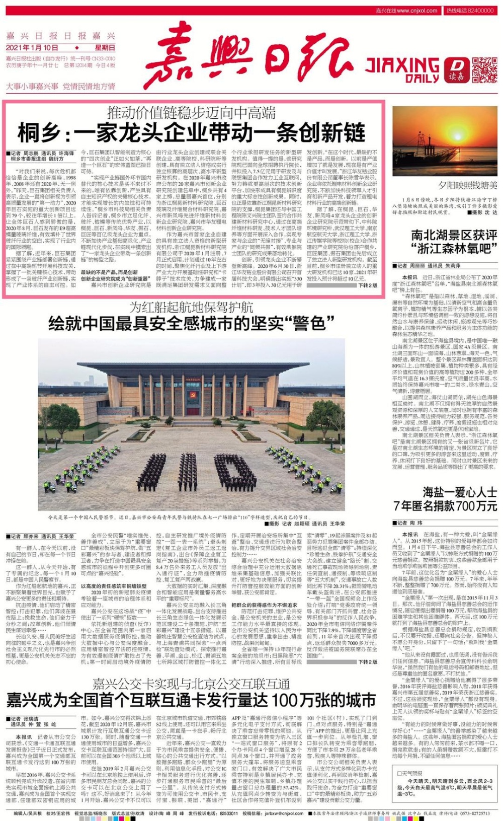 嘉兴日报头版头条点赞!桐乡:一家龙头企业带动一条创新链